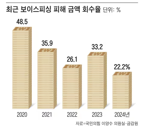 3일 금융감독원이 이양수 국민의힘 의원실에 낸 자료에 따르면, 보이스피싱 피해 회수율은 2020년 48.5%에서 2024년 22.2%로 절반 이하로 줄었다. 최근 10년간 최저 수치다. 회수율은 금감원에 신고된 보이스피싱 피해액 중 은행권의 지급 정지 조치로 돌려받은 금액의 비율을 의미한다. 통신 사기 피해 환급법에 따르면, 보이스피싱 피해자나 수사기관이 금융회사에 계좌 입출금 금지를 요청하면, 금융사는 즉각 지급을 정지해야 한다.